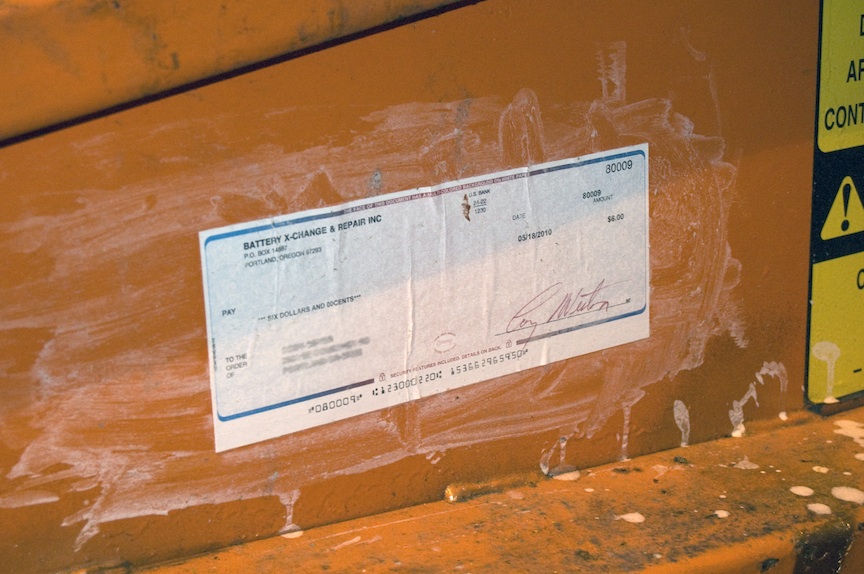 So word on the street is that this guy found a $6 check on the ground and went home with it. Then came back to where he found it and wheat pasted it to the dumbster that was next to it. I have no idea who he is but that is just the word on the street. I just so happened to get some photos of it. Funny as hell to me but sort of messed up. I blurred out the name and address on the check as well. What do you think of the photos of the incident?